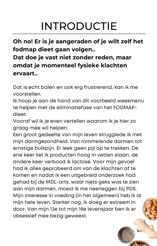 In het boek zul zien dat ik je eerst een complete uitleg geef over wat het FODMAP dieet inhoudt, wat mijn motivatie was om dit e-book te schrijven, een gedetailleerd vegetarisch FODMAP-proof weekmenu en een boodschappenlijst.